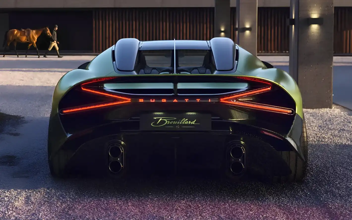 Хиперколата наистина е базирана на платформата Chiron, но каросерията тук е напълно оригинална и отчасти вдъхновена от модела W16 Mistral . Brouillard е аеродинамично изпитано купе с изразителни дизайнерски решения: масивна предна броня с решетка във формата на подкова, LED фарове с въздухозаборници, контрастни елементи от въглеродни влакна и яркозелена боя.