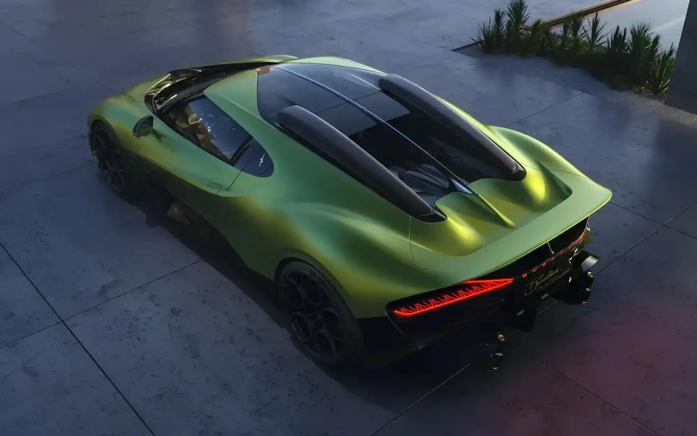 Зелената цветова схема е комбинирана с изобилие от алуминий и въглеродни влакна, а ключовият детайл в интериора е миниатюрна скулптура на кон на име Бруйяр, ръчно изработена и поставена в стъклена вложка на скоростния лост.