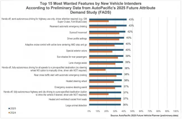 Желанието за още по-комплексна автоматизация също нараства. Проучването на AutoPacific установи, че забележителните 48% от купувачите вече желаят автомобил, способен на напълно автономно шофиране, което им позволява да се занимават с други дейности или просто да се отпуснат. Това представлява значително увеличение с 10 процентни пункта спрямо предходната година. Други ADAS функции, като автоматично аварийно спиране при движение назад, също отбелязват значително увеличение на търсенето.