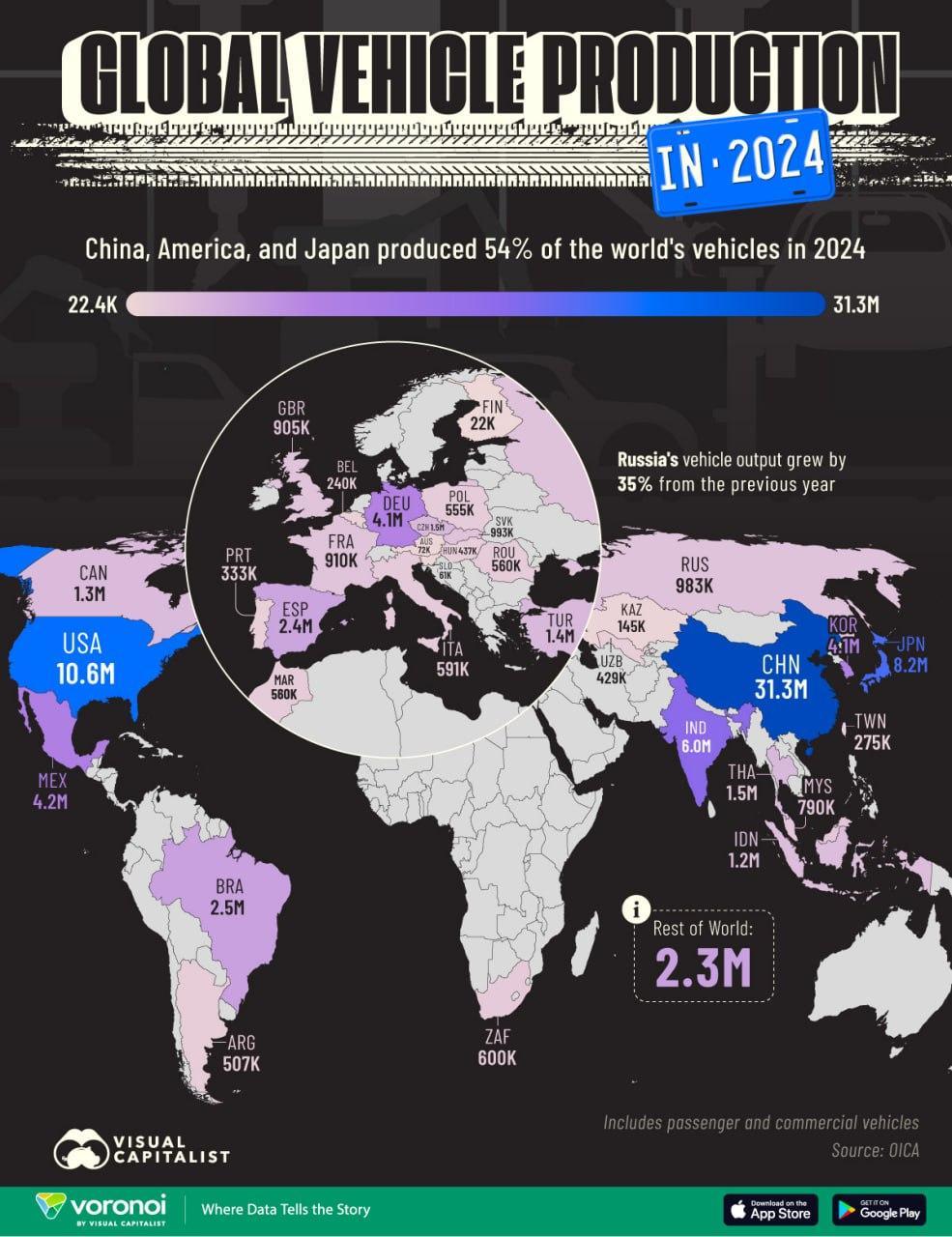 Инфографиката е създадена с помощта на данни от Международната асоциация на производителите на автомобили (OICA), която координира взаимодействията между производителите и международните автокъщи.